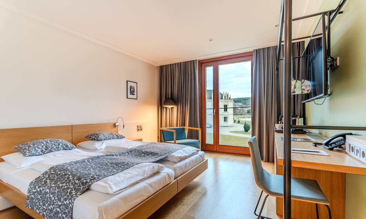 Das Schloss ist ein historisches Schmuckstück mit einem modernen Gästeanbau inmitten der Schwarzföhrenwäldern.