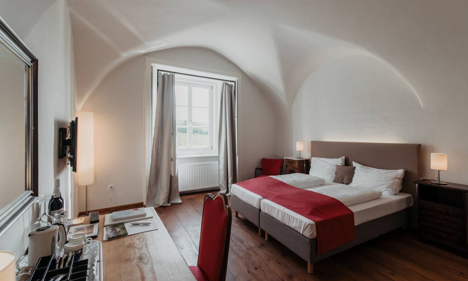 Culinary delights are offered at the estate’s own Klostergasthaus, serving regional specialties and seasonal dishes. The on-site regional wine shop showcases selected wines from more than 20 wineries in the Thermenregion, complemented by culinary highlights from Lower Austria and Styria, making Thallern a popular destination for connoisseurs.
